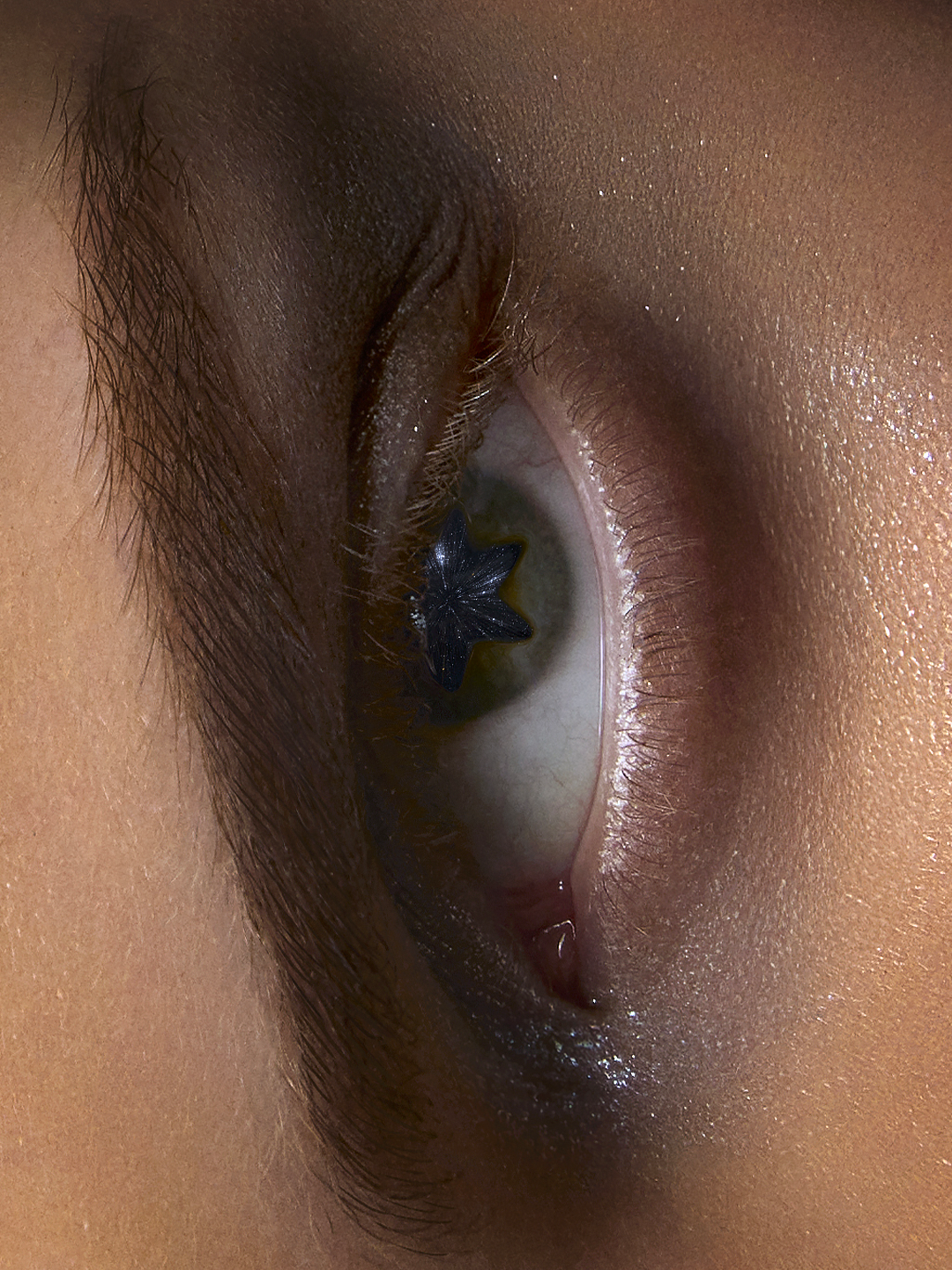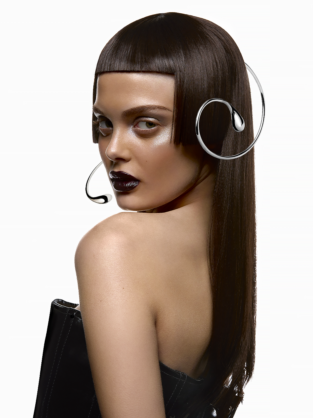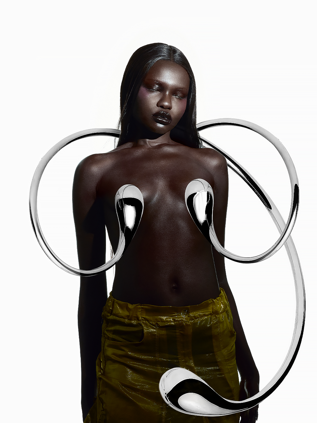 This concept explores light reflecting off materials and the sculptural silhouette of the model, embodying a futuristic divinity.